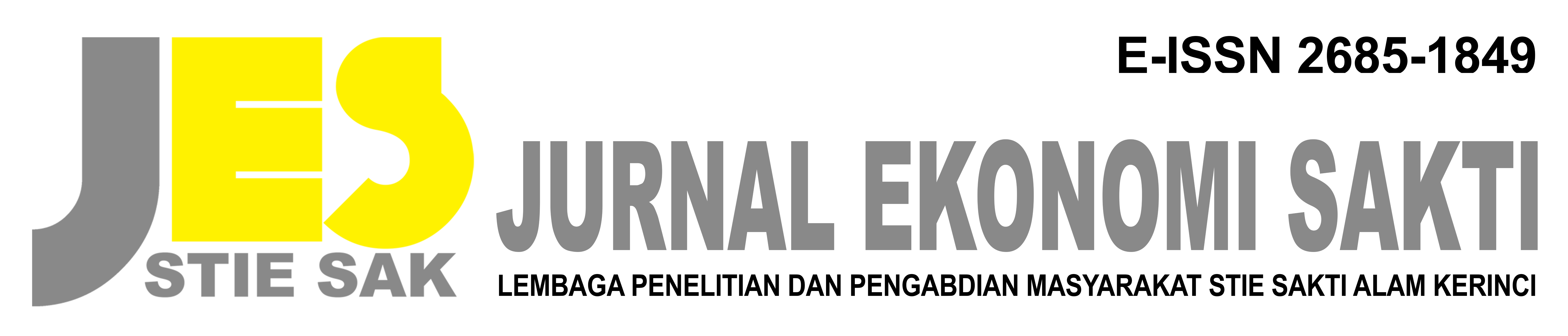 Jurnal Ekonomi Sakti (JES) adalah jurnal peer-review yang diterbitkan oleh Lembaga Penelitian dan Pengabdian Masyarakat – Sekolah Tinggi Ilmu Ilmu Ekonomi Sakti Alam Kerinci ; sudah memiliki nomor E-ISSN 2685-1849. Jurnal ini menyediakan forum bagi para akademisi dan profesional untuk berbagi perkembangan dan kemajuan terbaru dalam pengetahuan dan praktik bidang ini yang bertujuan untuk mendorong pertukaran ide tentang berbagai mata pelajaran penting dan untuk memberikan stimulus untuk penelitian dan pengembangan ilmu pengetahuan lebih lanjut di bidang ekonomi, manajemen, dan akuntansi. Sejak tahun 2018 sampai tahun 2022, Jurnal Ekonomi Sakti (JES) terbit rutin 2 kali dalam setahun, pada bulan Juni dan Desember dengan 5 (lima) artikel setiap penerbitan. Mengingat tingginya minat publikasi maka mulai tahun 2023 Jurnal Ekonomi Sakti (JES) terbit 3 kali dala setahun yaitu bulan April, Agustus dan Desember dengan 10 (sepuluh) artikel setiap penerbitan. |